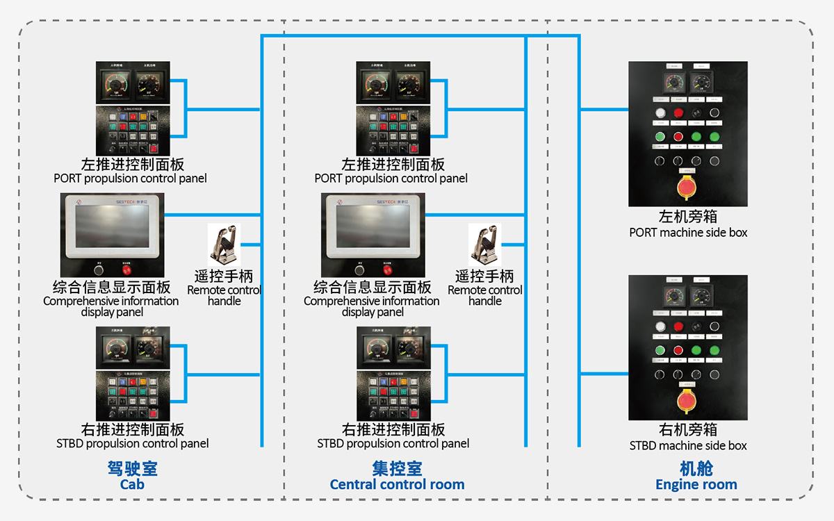 遙控系統(tǒng)由機旁控制、駕控控制、電池系統(tǒng)控制及綜合監(jiān)控系統(tǒng)組成,整套遙控系統(tǒng)和電力推進系統(tǒng)基于PLC控制單元和現(xiàn)場總線網(wǎng)絡相結(jié)合,實現(xiàn)船員對于整船動力的人機交互和控制功能,可以通過不同站點實現(xiàn)對推進電機的啟停、調(diào)速控制,以及各站點的操作切換,同時可以實時監(jiān)控船舶推進系統(tǒng)各個設備的運行狀態(tài)、報警信息。