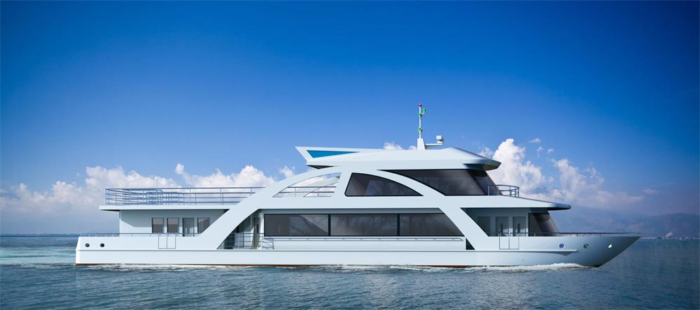 該新能源游船總長34.9m,型寬7m,設(shè)計吃水0.8m,推進(jìn)功率2*200kW,設(shè)計航速19 km/h。采用賽思自主知識產(chǎn)權(quán)的直流組網(wǎng)電力推進(jìn)系統(tǒng)(S-Hybrid-R柴電+新能源混合系統(tǒng)),其核心直流組網(wǎng)變頻配電系統(tǒng)采用公司自主知識產(chǎn)權(quán)產(chǎn)品。
