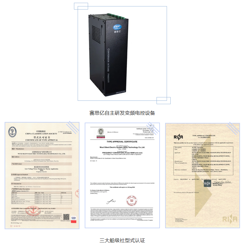 本項目采用了賽思億公司自主研發(fā)的有源前端形式(AFE)的國產(chǎn)船舶電力推進變頻電控設備,其核心部件采用賽思億自主研發(fā)的變頻器。該變頻器具有CCS、RINA、BV三大船級社型式認證,已廣泛應用于直流組網(wǎng)電力推進、交流組網(wǎng)電力推進、軸帶混合動力和岸電變頻電源等場景中,該風電施工平臺是國產(chǎn)變頻在海上風電領域的再次應用。
