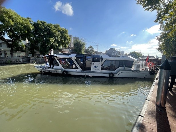 無錫古運(yùn)河28客位 “樂游1號(hào)、樂游2號(hào)” 游船,由江蘇江南古運(yùn)河旅游股份有限公司出資、常州晨光游艇制造有限公司建造,采用賽思億S-Renewable新能源動(dòng)力系統(tǒng),該船船長(zhǎng)14.80m,型寬3.60m,系統(tǒng)配置共接入2組鋰電池組,整船鋰電池容量共計(jì)215kWh,驅(qū)動(dòng)2臺(tái)11kW的主推電機(jī)。目前已順利交付船東使用。