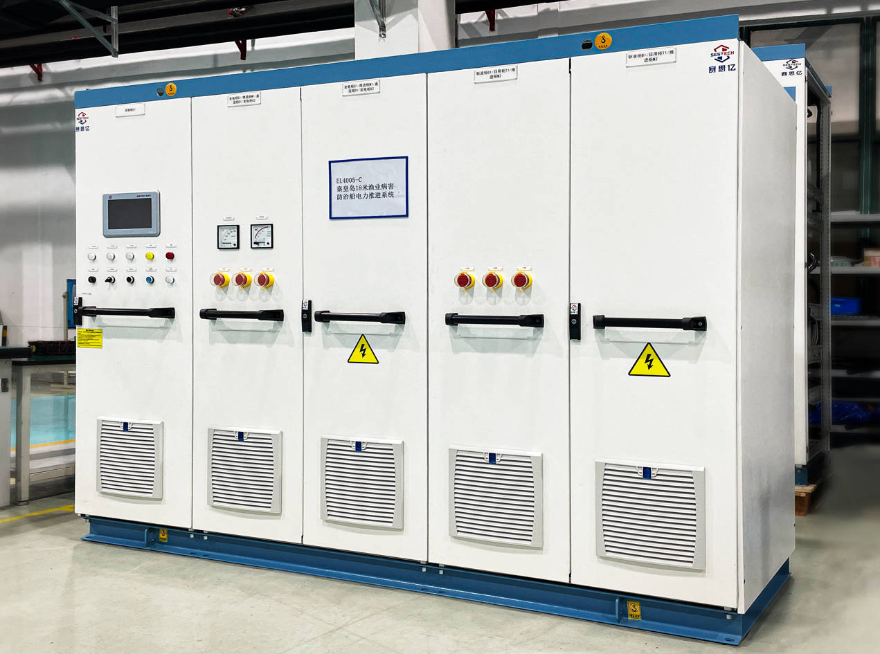 該6艘系列船舶由漁業(yè)機(jī)械儀器研究所設(shè)計(jì)、蘇州飛馳環(huán)??萍脊煞萦邢薰窘ㄔ?,總長(zhǎng)19.60m,設(shè)計(jì)水線長(zhǎng)18.50m,型寬4.60m,型深1.80m,設(shè)計(jì)吃水1.20m,系統(tǒng)配置2臺(tái)90kW的發(fā)電機(jī)組,1套322.56kWh鋰電池組,是新一代節(jié)能環(huán)保船型,主要用于秦皇島北戴河及附近海域赤潮治理工作。其中,變頻控制柜、鋰電池組、主推進(jìn)電機(jī)、推進(jìn)遙控系統(tǒng)、交流配電板、主變壓器等動(dòng)力系統(tǒng)設(shè)備均由賽思億集成供貨,而動(dòng)力系統(tǒng)關(guān)鍵裝備——變頻控制柜、推進(jìn)遙控系統(tǒng)均由賽思億負(fù)責(zé)設(shè)計(jì)生產(chǎn)和制造,擁有完全自主知識(shí)產(chǎn)權(quán)。