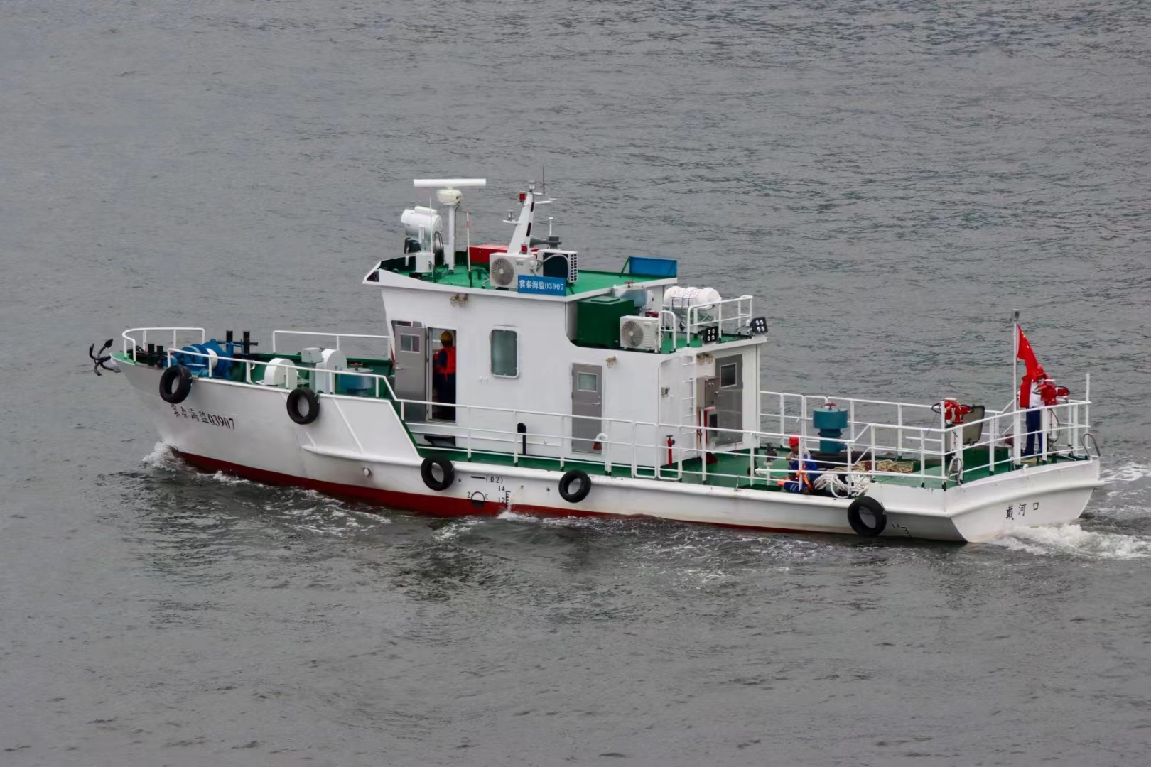 “冀秦海監(jiān)03901、冀秦海監(jiān)03902、冀秦海監(jiān)03903、冀秦海監(jiān)03905、冀秦海監(jiān)03906、冀秦海監(jiān)03907”,該6艘系列船舶由漁業(yè)機(jī)械儀器研究所設(shè)計(jì)、蘇州飛馳環(huán)保科技股份有限公司建造,總長(zhǎng)19.60m,設(shè)計(jì)水線長(zhǎng)18.50m,型寬4.60m,型深1.80m,設(shè)計(jì)吃水1.20m,系統(tǒng)配置2臺(tái)90kW的發(fā)電機(jī)組,1套322.56kWh鋰電池組,是新一代節(jié)能環(huán)保船型,主要用于秦皇島北戴河及附近海域赤潮治理工作。系列船舶動(dòng)力系統(tǒng)均由賽思億集成供貨,其中動(dòng)力系統(tǒng)關(guān)鍵裝備——變頻控制柜、推進(jìn)遙控系統(tǒng)均由賽思億負(fù)責(zé)設(shè)計(jì)生產(chǎn)和制造,擁有完全自主知識(shí)產(chǎn)權(quán)。