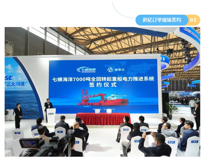 12月6日,七橫海洋7000噸全回轉(zhuǎn)起重船電力推進(jìn)系統(tǒng)簽約儀式在W5館中國船舶集團(tuán)發(fā)布區(qū)正式舉辦。簽約儀式由中船賽思億營銷總監(jiān)郭偉主持,上海七橫海洋工程有限公司董事長潘喜、中船賽思億總經(jīng)理烏云翔發(fā)表致辭。在七橫海洋董事長潘喜、總經(jīng)理姜鵬、中船賽思億總經(jīng)理烏云翔、副總經(jīng)理邵詩逸、江蘇海藝船舶科技有限公司總經(jīng)理陶開友、江蘇創(chuàng)譽(yù)船舶與海洋工程有限公司總經(jīng)理祁長青等見證人的見證下,七橫海洋商務(wù)總監(jiān)史泰龍、中船賽思億副總經(jīng)理桑成棟順利完成簽約。