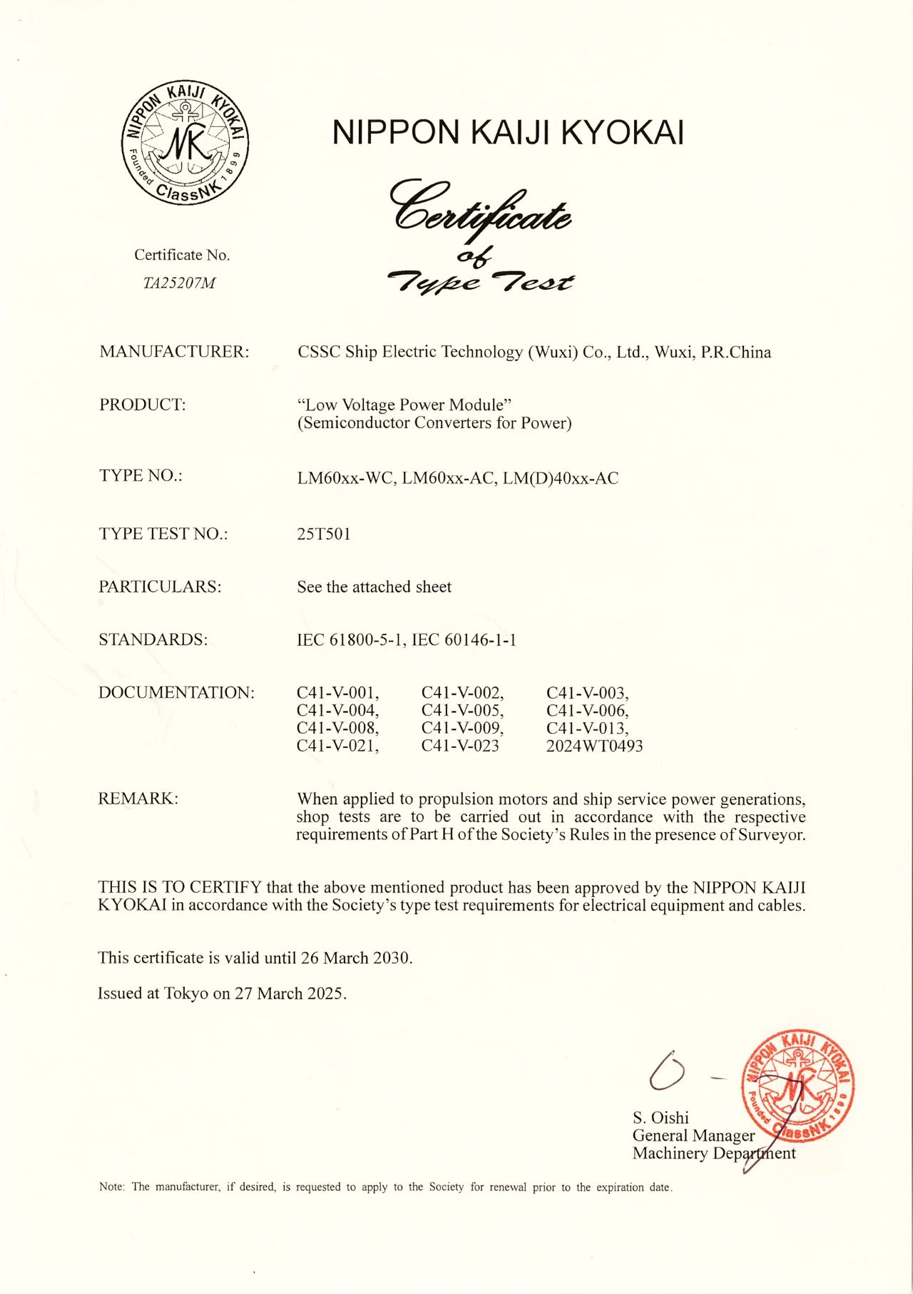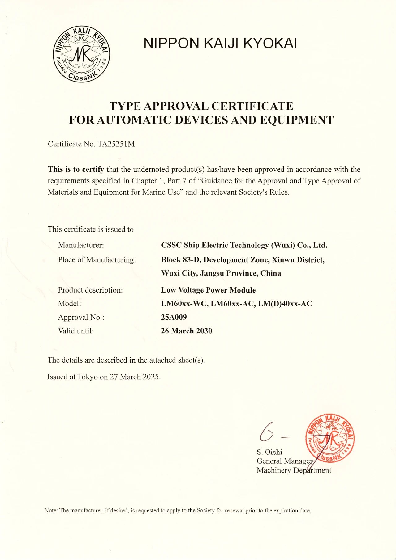 2025年3月27日,中船賽思億(無錫)電氣科技有限公司(CSSC Ship Electric Technology ( Wuxi) Co.,Ltd.)核心變頻電控設(shè)備順利取得日本船級社(NK)型式認(rèn)可證書,成為國內(nèi)為數(shù)不多的取得日本船級社(NK)型式認(rèn)可證書的船舶電力推進(jìn)企業(yè)。目前中船賽思億已取得CCS、BV、RINA、DNV、LR、ABS、NK等七大國際主流船級社型式認(rèn)可證書,是目前國內(nèi)唯一一家擁有七大船級社型式認(rèn)可證書的國產(chǎn)船舶電力推進(jìn)企業(yè),對中船賽思億的海內(nèi)外市場開拓和國際化發(fā)展進(jìn)程,具有重要意義。
