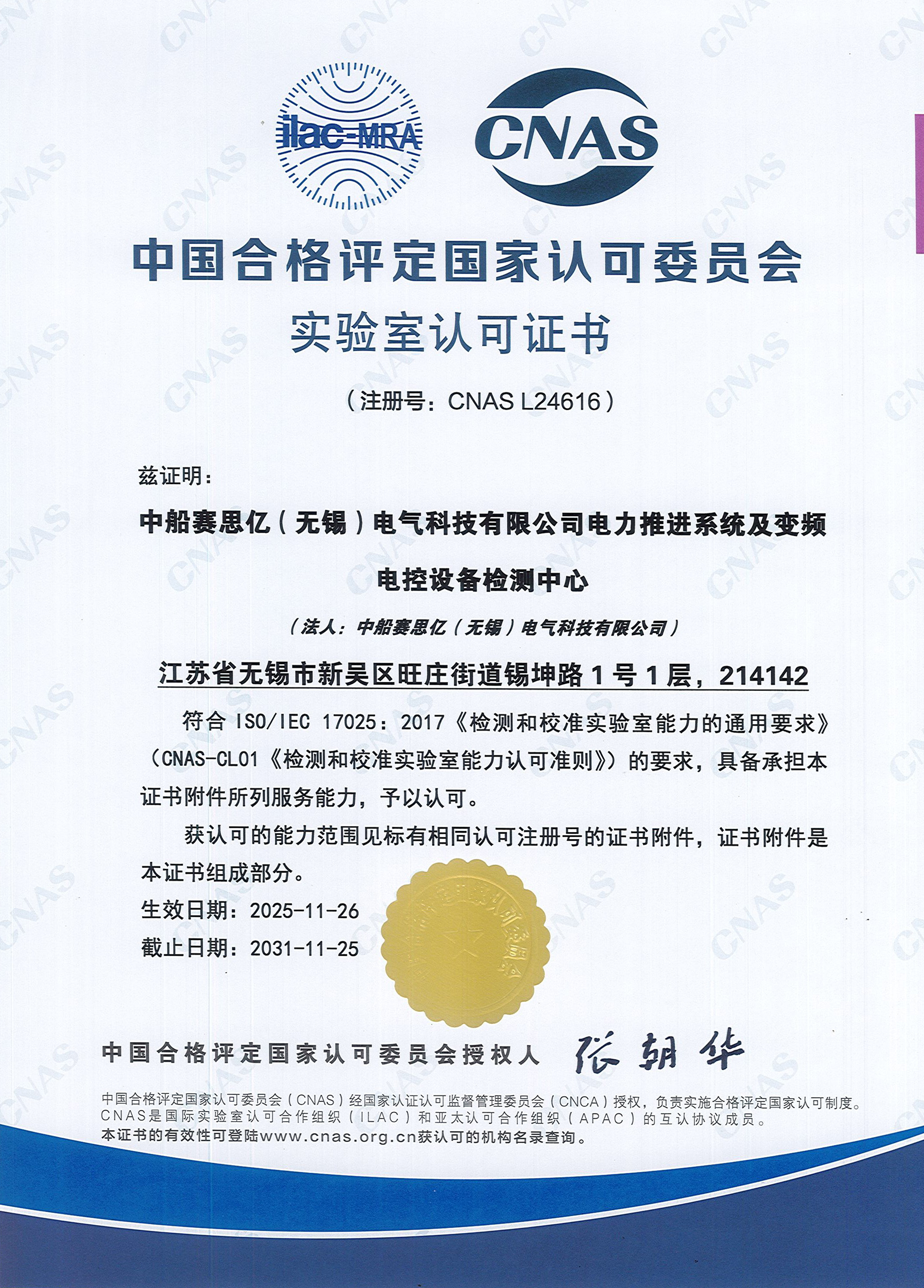 2025年11月26日,中船賽思億(無錫)電氣科技有限公司(CSSC Ship Electric Technology ( Wuxi) Co.,Ltd.)電力推進系統(tǒng)及變頻電控設備檢測中心順利取得中國合格評定國家認可委員會(CNAS)實驗室認可證書(注冊號:CNAS L24616),此舉標志著中船賽思億在電力推進系統(tǒng)性能驗證、變頻電控設備可靠性測試等核心環(huán)節(jié)的檢測能力,以及全流程質(zhì)量管理體系已達到了國家 / 國際認可的水平,該檢測中心出具的檢測數(shù)據(jù)、報告在國內(nèi)及互認的國際范圍內(nèi)具備高權威性和公信力。