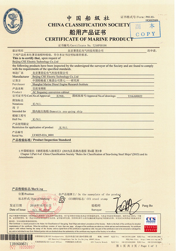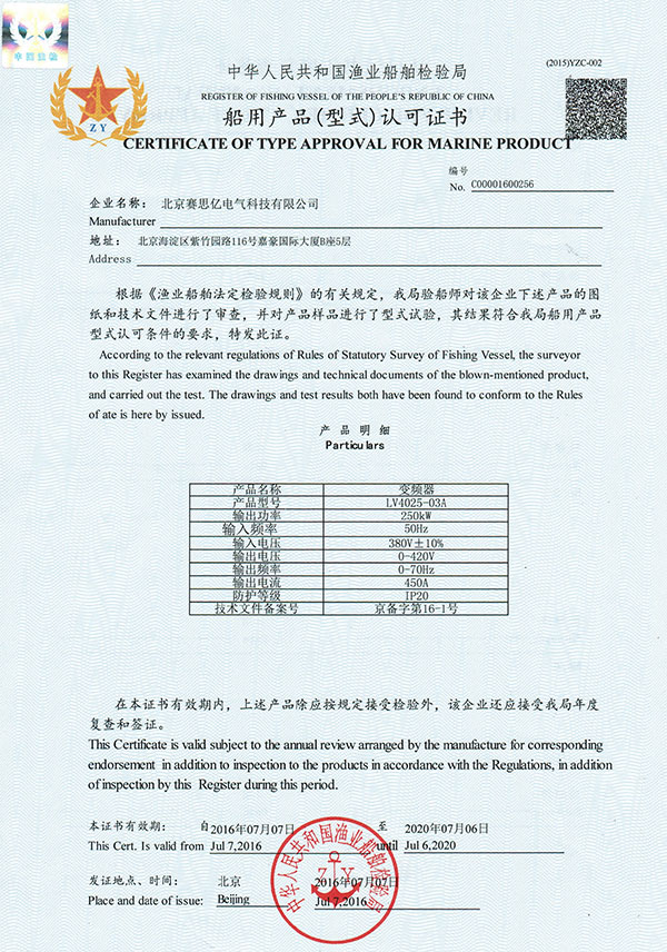 “浙漁科2”號柴電混合動(dòng)力系統(tǒng)變頻器船檢及漁檢證書