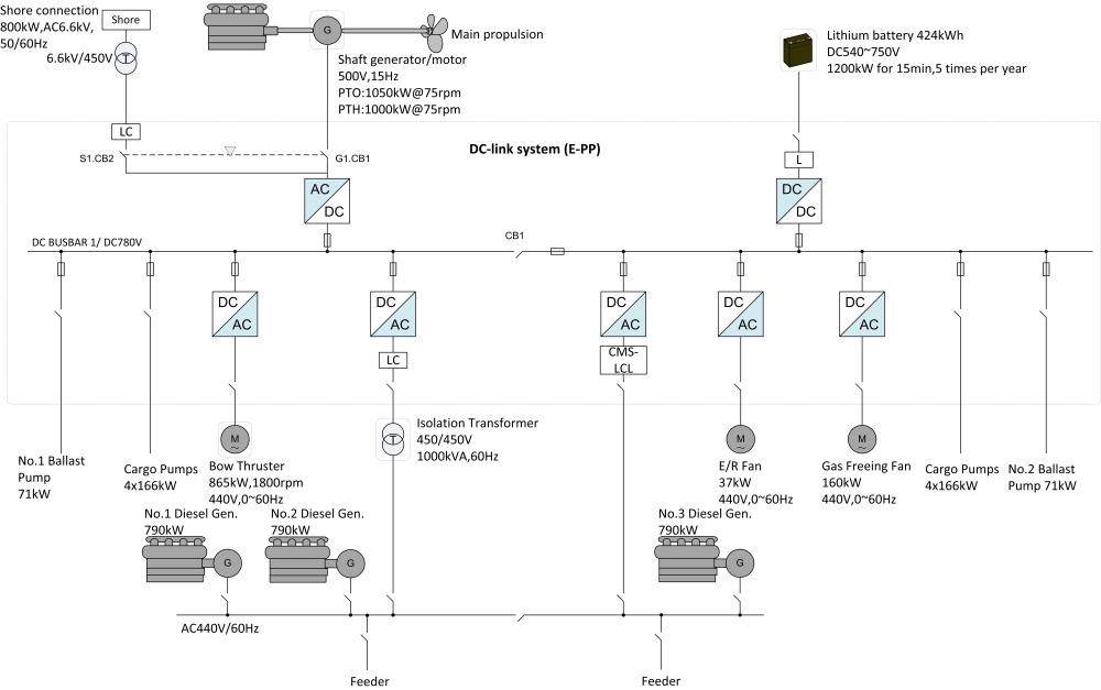 鼎衡15000噸化學(xué)品船,船舶總長147米,型寬22米,入級BV船級社,抱軸電機額定功率為1000kW,同時配置424kWh電池達(dá)到削峰填谷的目的,該船舶混合動力系統(tǒng)采用直流組網(wǎng)形式,將主機、發(fā)電機組、電池動力整合并高效分配,為用戶提供高效、綠色、可靠的混合動力。將于2021年年初完成安裝調(diào)試。